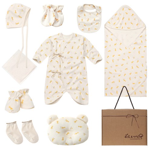 속싸개, 배냇저고리, 손발싸개, 턱받이 등 신생아 필수품을 한 번에 준비할 수 있는 구성입니다. 위드오가닉은 100% 오가닉 코튼 원단을 사용해 민감한 아기 피부에도 안전합니다. 컬러와 디자인이 깔끔해 선물 포장까지 예쁘게 되어 있어, 출산 선물로 주기 좋습니다.